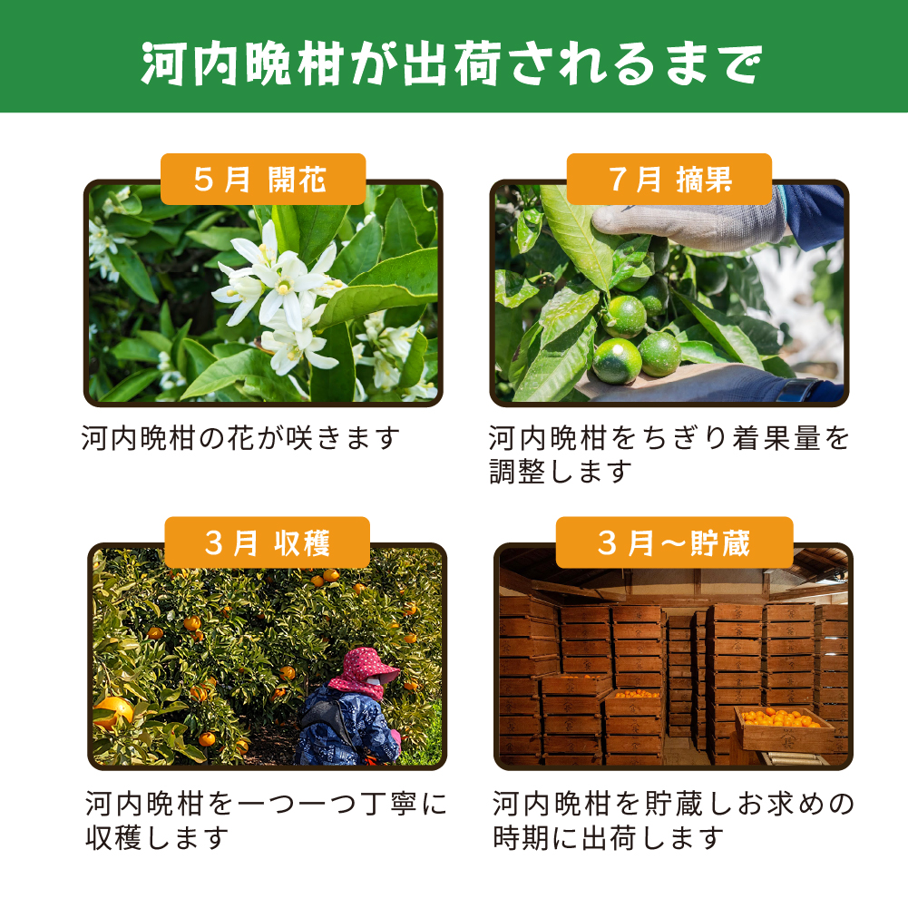 藤原農園の河内晩柑は木成りで越冬させるため、収穫時期、旬の時期は3月~4月となります。(その年の気候により多少前後します)