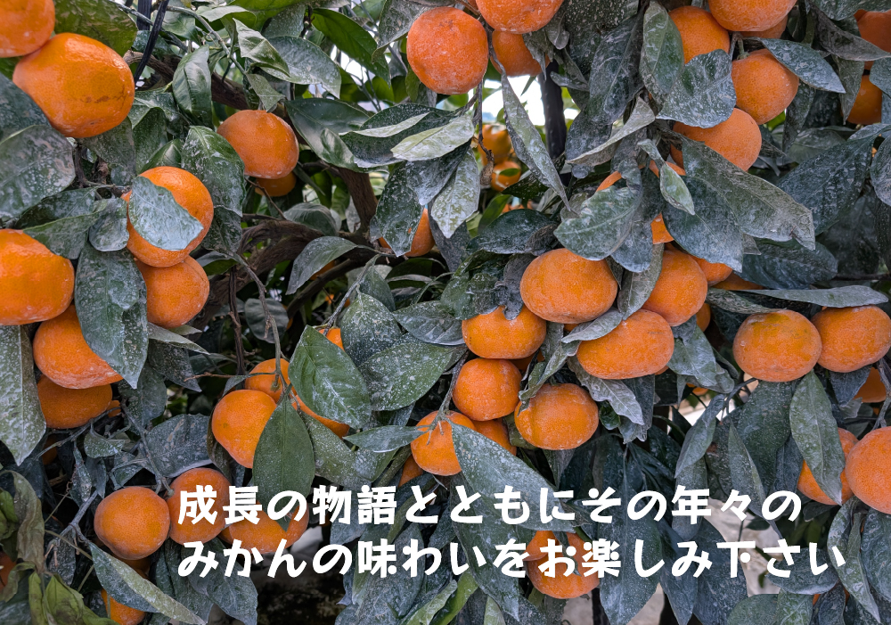 みかんは苗木を植えてから3,4歳から実をつけはじめ、10年程度で生産が安定し、2~30年が働き盛り。そして50年ぐらいまで実をつけ続けます。そして年数を重ねるごとに味わいにコクが生まれていきます。移り行くみかんの味わいを毎年の栽培の風景とともに楽しんでもらいたい。そんな想いで生まれたのがこの、「みかんの一生」です。